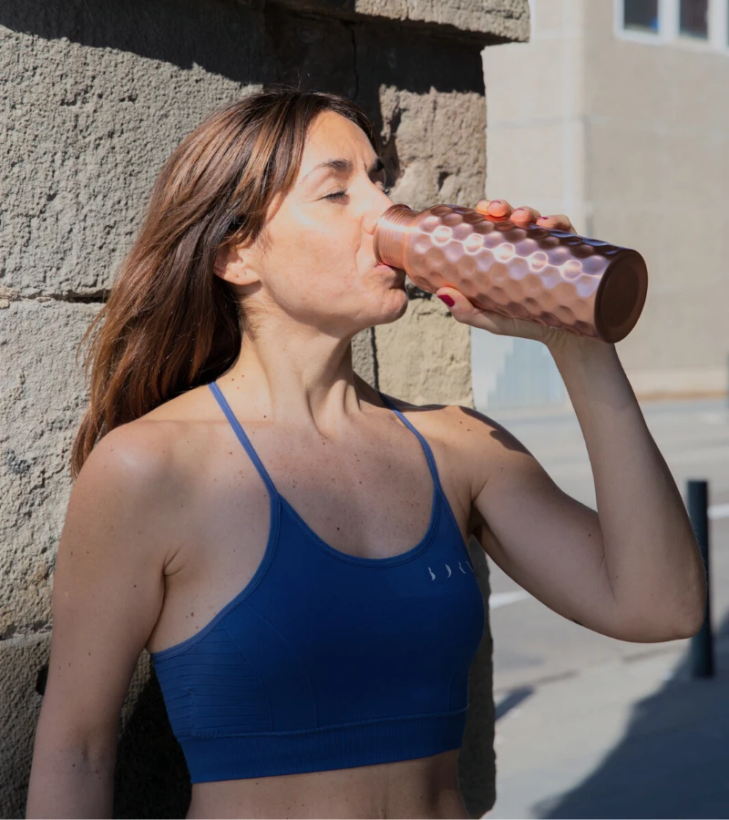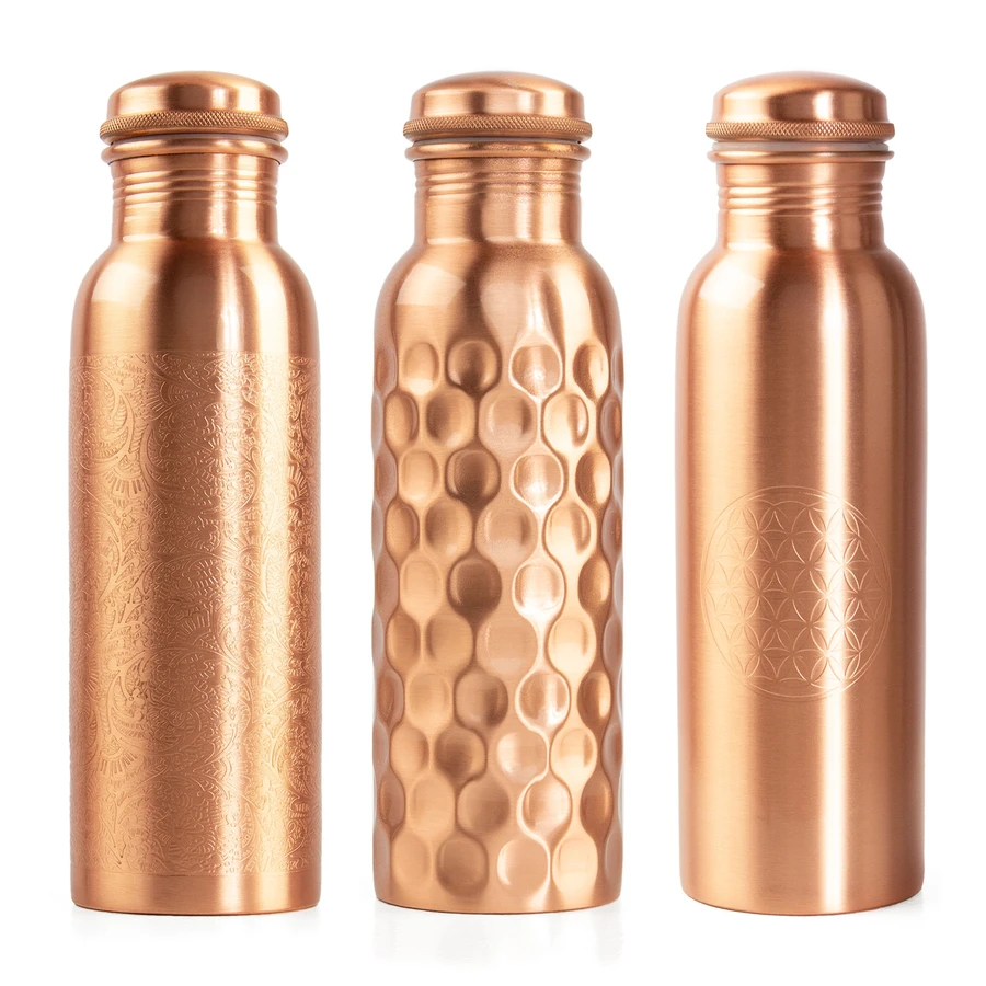 En Ayurveda, beber agua de una botella de cobre siempre se ha utilizado por sus propiedades curativas. Según las enseñanzas ayurvédicas, se dice que el agua con cobre equilibra los tres doshas (Vata, Pitta y Kapha), fortalece el sistema inmunológico, ralentiza el proceso de envejecimiento, estimula el cerebro y actúa como un antioxidante natural.