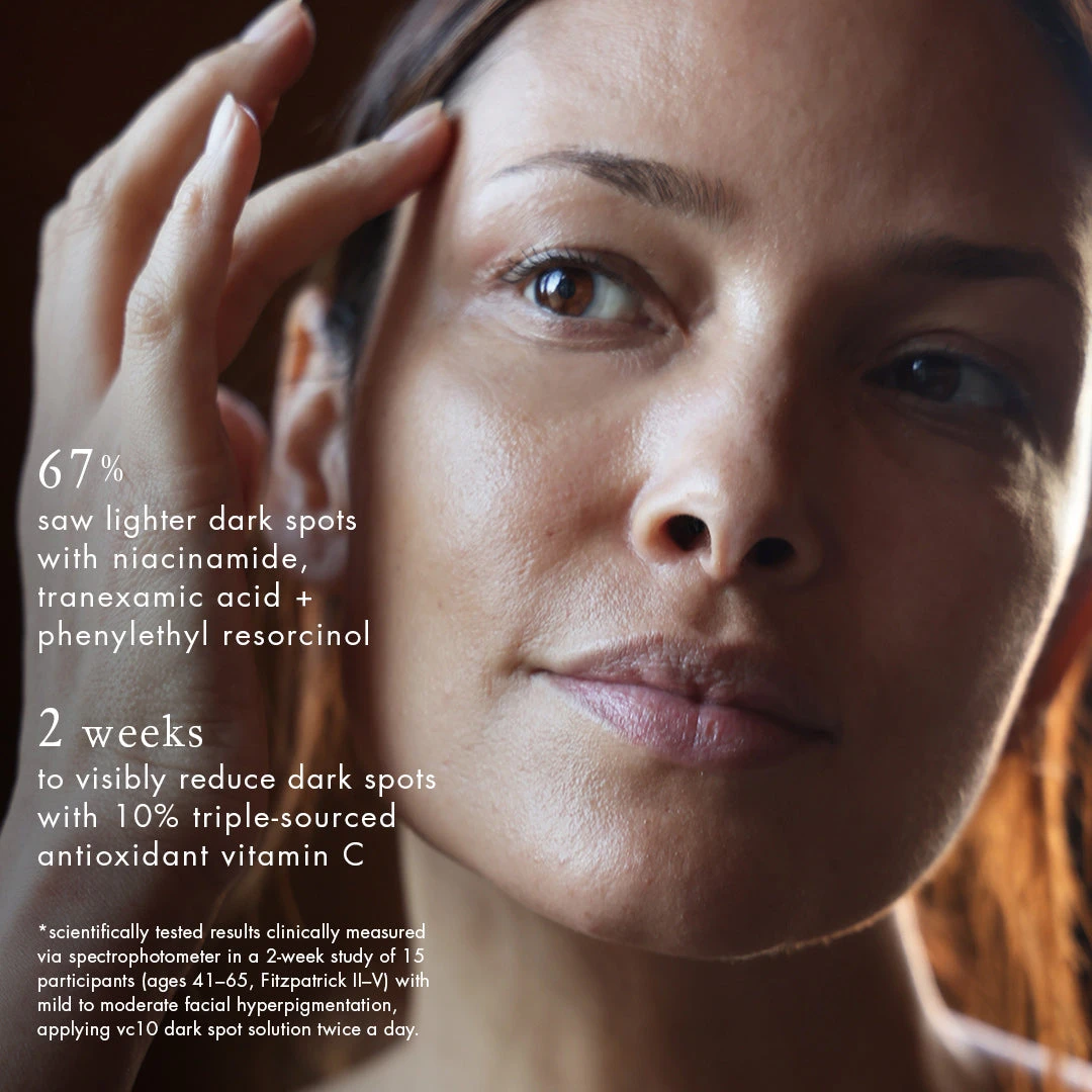This hyper-focused vitamin C creme works only where it’s needed – to improve dark spots and discoloration caused by sun, aging or post-acne damage. Powered by our signature vc10 concentration of 10% stabilized vitamin C triple-sourced from C derivatives + natural acerola cherries, we added clinical doses of niacinamide, tranexamic acid and phenylethyl resorcinol to target pigmentation formation, improve irregular discoloration and correct the appearance of dark spots.